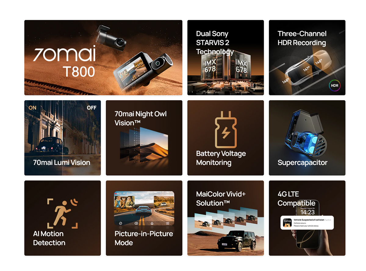 70mai Dash Cam T800 4K s RC24 stražnjom kamerom pruža 4K snimanje prednjom kamerom i Full HD snimanje stražnjom kamerom. No, za sveobuhvatno snimanje, T800 donosi i treću - integriranu kameru za unutrašnjost. Rezultat je potpuna pokrivenost, s ultra detaljnim slikama iz svakog kuta.