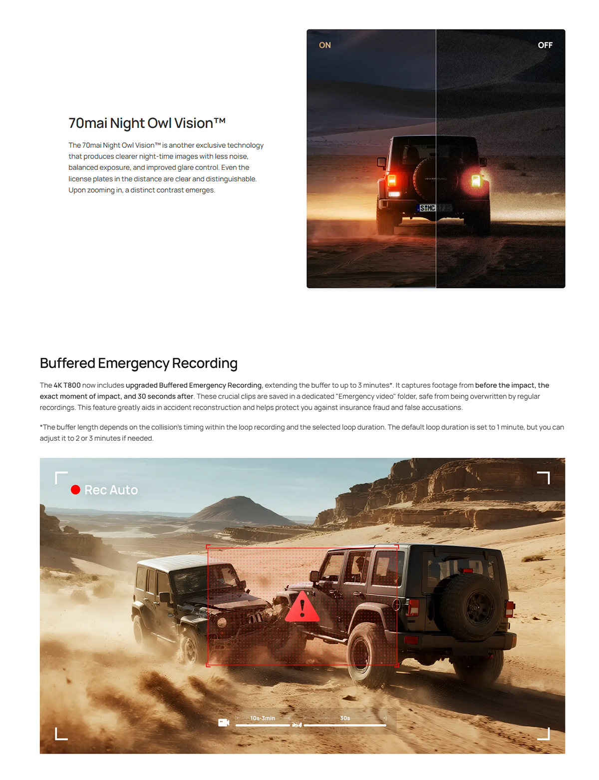 70mai Night Owl Vision™ ekskluzivna je 70mai tehnologija koja stvara jasnije noćne slike s manje smetnji, uravnoteženom ekspozicijom i poboljšanom kontrolom odsjaja.
