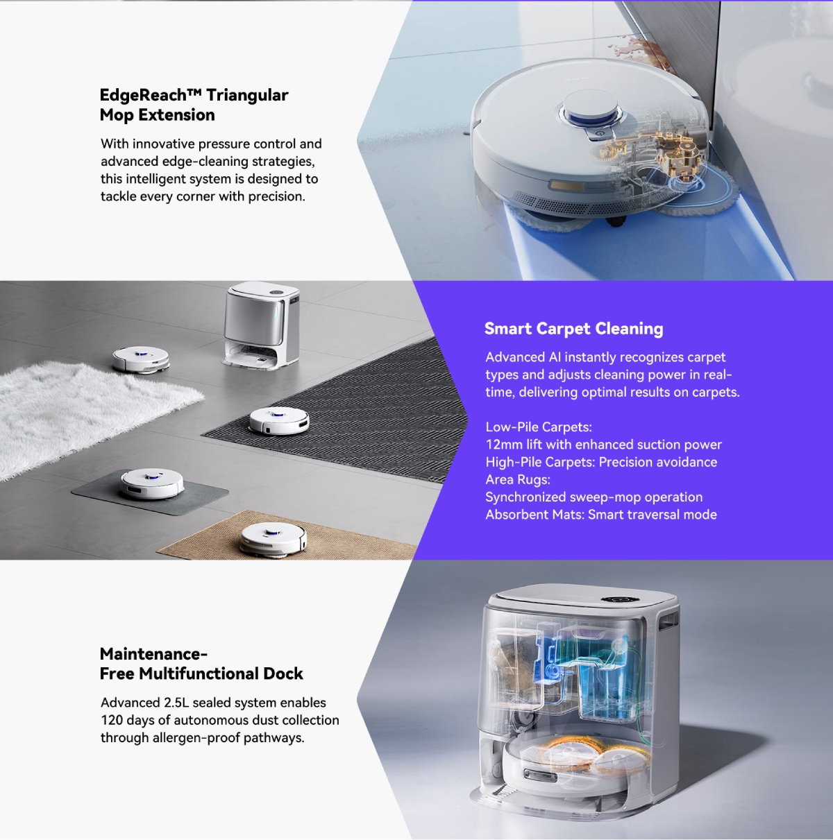 Ono što posebno izdvaja ovaj model robota je 10-u-1 bazna stanica koja omogućuje do 10 automatiziranih funkcija koje olakšavaju vaš angažman pri čišćenju. Bazna stanica uključuje automatsko pražnjenje od prašine, automatski dozator deterdženta, automatsko čišćenje stanice, AI pranje toplom vodom, sušenje vrućim zrakom...